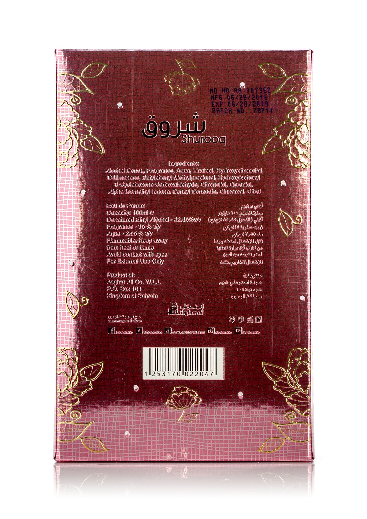 SHUROOQ spray a fragrance of Men, have top notes of citrus, pink pepper and hyacinth, while heart note combines of a fruity scented pineapple, orris and jasmine to bring that heavenly scent of flowers and the scent of marine which are all classic ingredients for a woody ambery hesperidic scent and lastly combining with the base note that includes of amber, musk, patchouli and a pinch of sweet vanilla to create rich tones of incense and dark wood that leave a distinctive, seductive smell on the skin. Presented in a black elegantly designed 100 ml bottle.